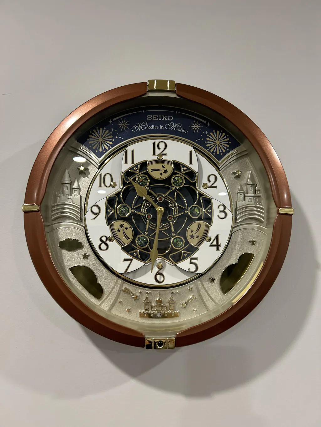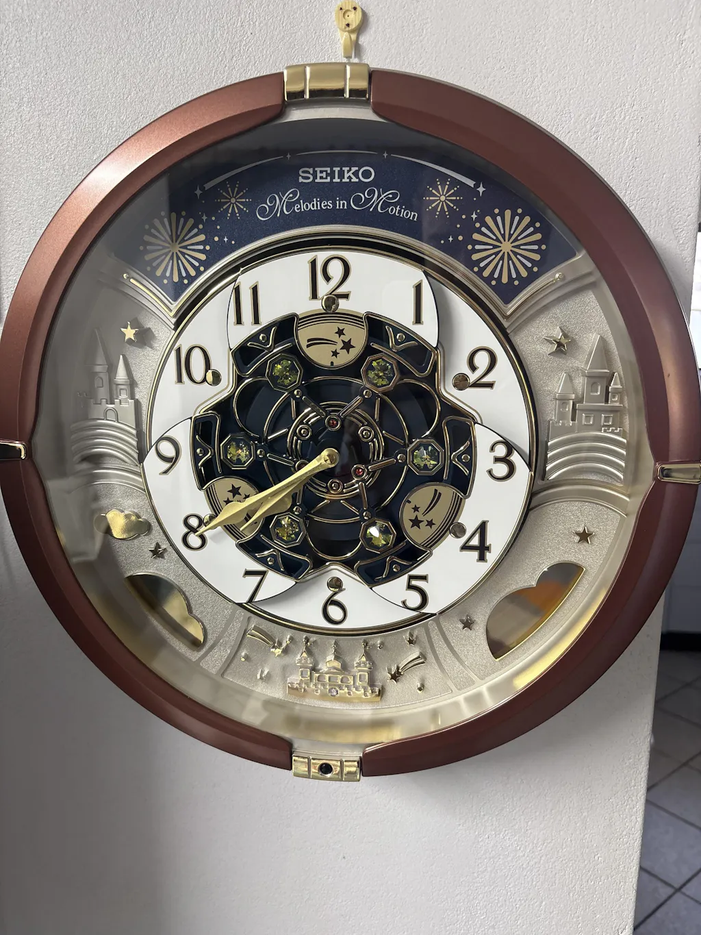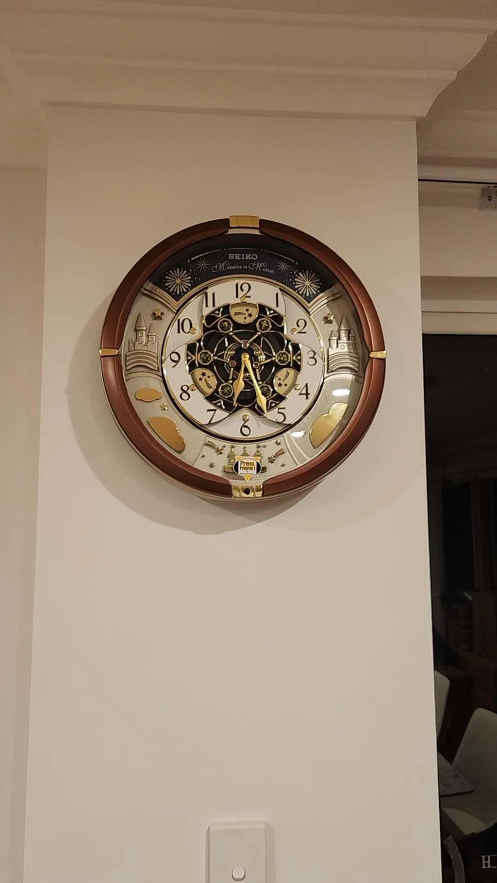 - On the hour dial opens and rotates while playing randomly one of 18 melodies with opening/closing sequence