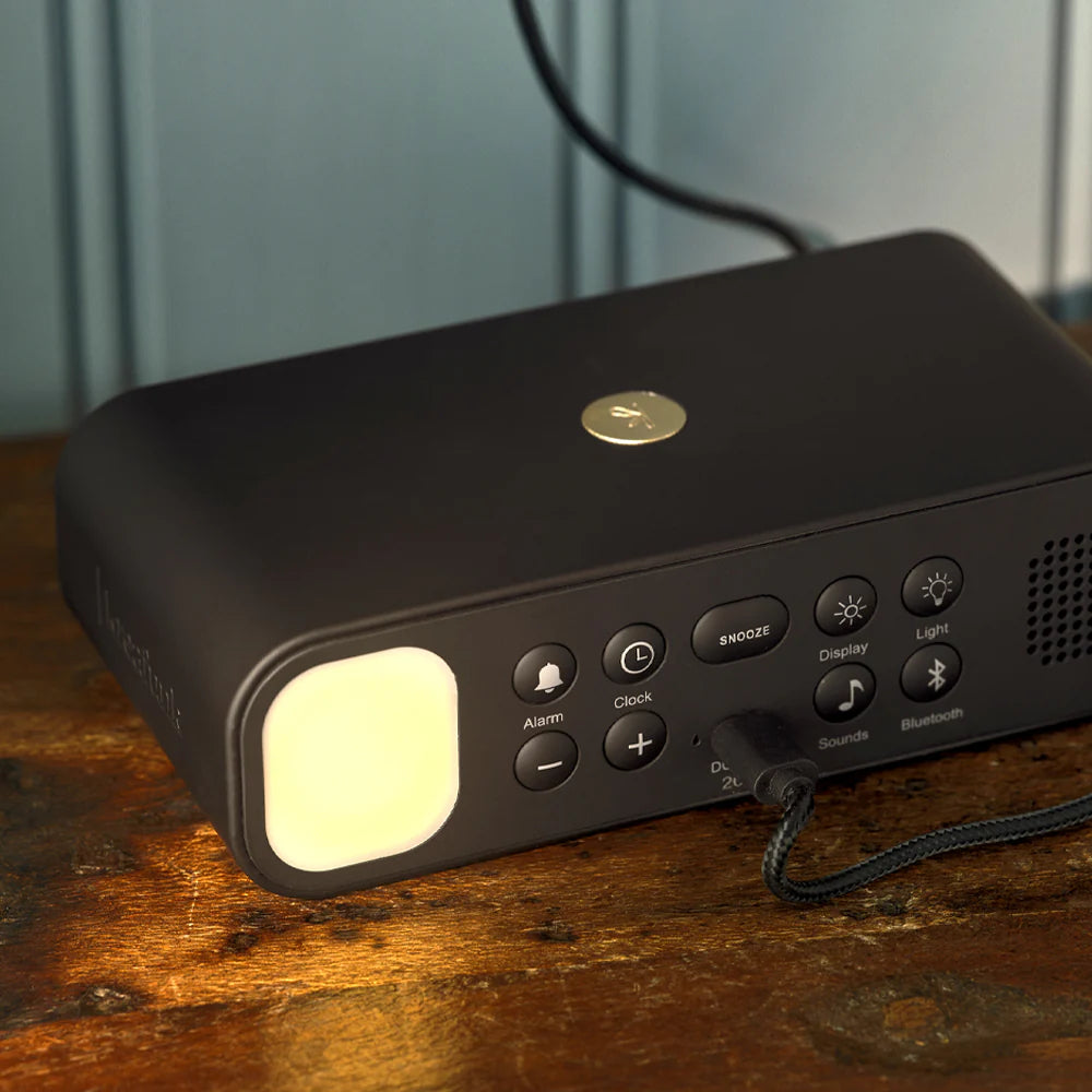 Understated elegance defines this stone-toned alarm clock and wireless charging station that seamlessly integrates into any bedroom aesthetic. The soft, neutral finish creates a calming bedside presence while housing innovative sleep technology designed to enhance your daily rhythms. Progressive wake-up light technology mimics natural sunrise, gradually brightening before your alarm to promote healthier awakening cycles. Six thoughtfully selected alarm tones provide personalised morning experiences, while dedicated sleep sounds facilitate evening wind-down routines. The integrated 15W wireless charging surface eliminates bedside cable clutter, keeping your phone powered throughout the night. At 160mm wide with a 3W Bluetooth speaker, it delivers quality audio for relaxation.