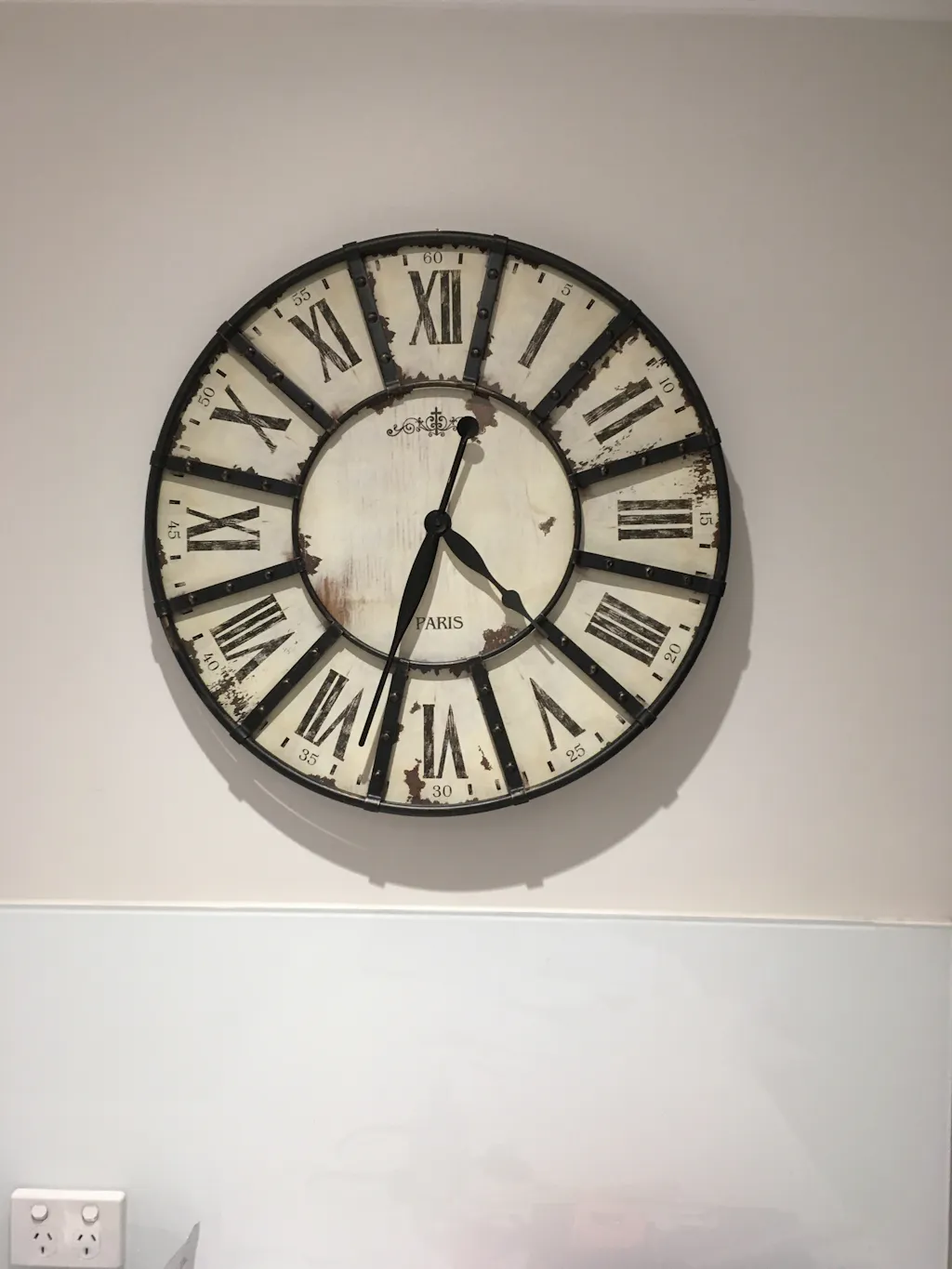 - Large black hands and rustic metal riveted casing give it a classic industrial look.