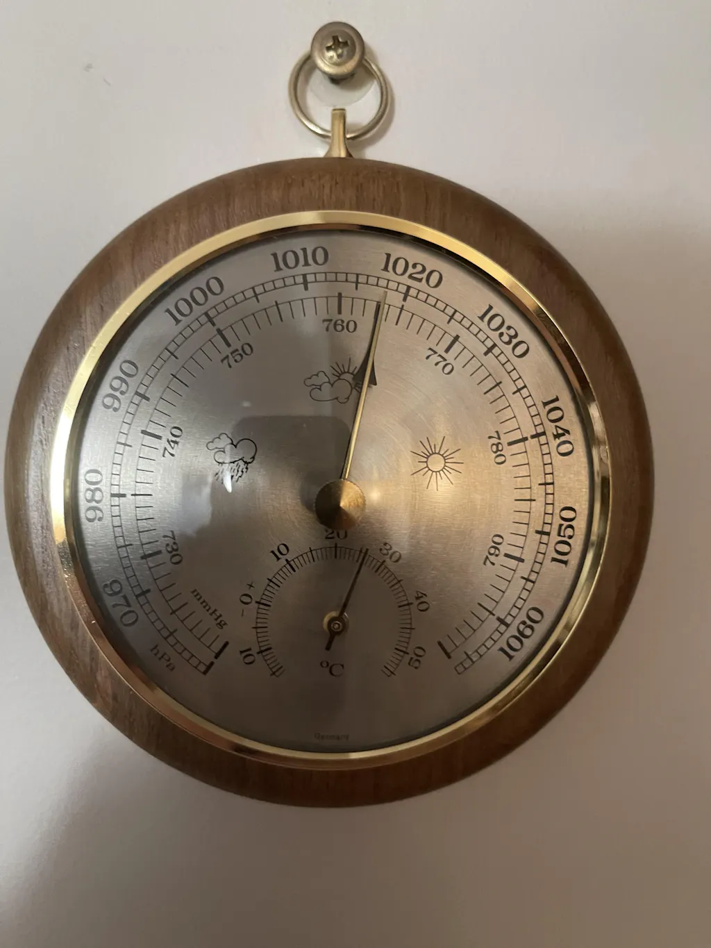 - Brass dialed barometer with small thermometer at the bottom housed in gold toned frame.