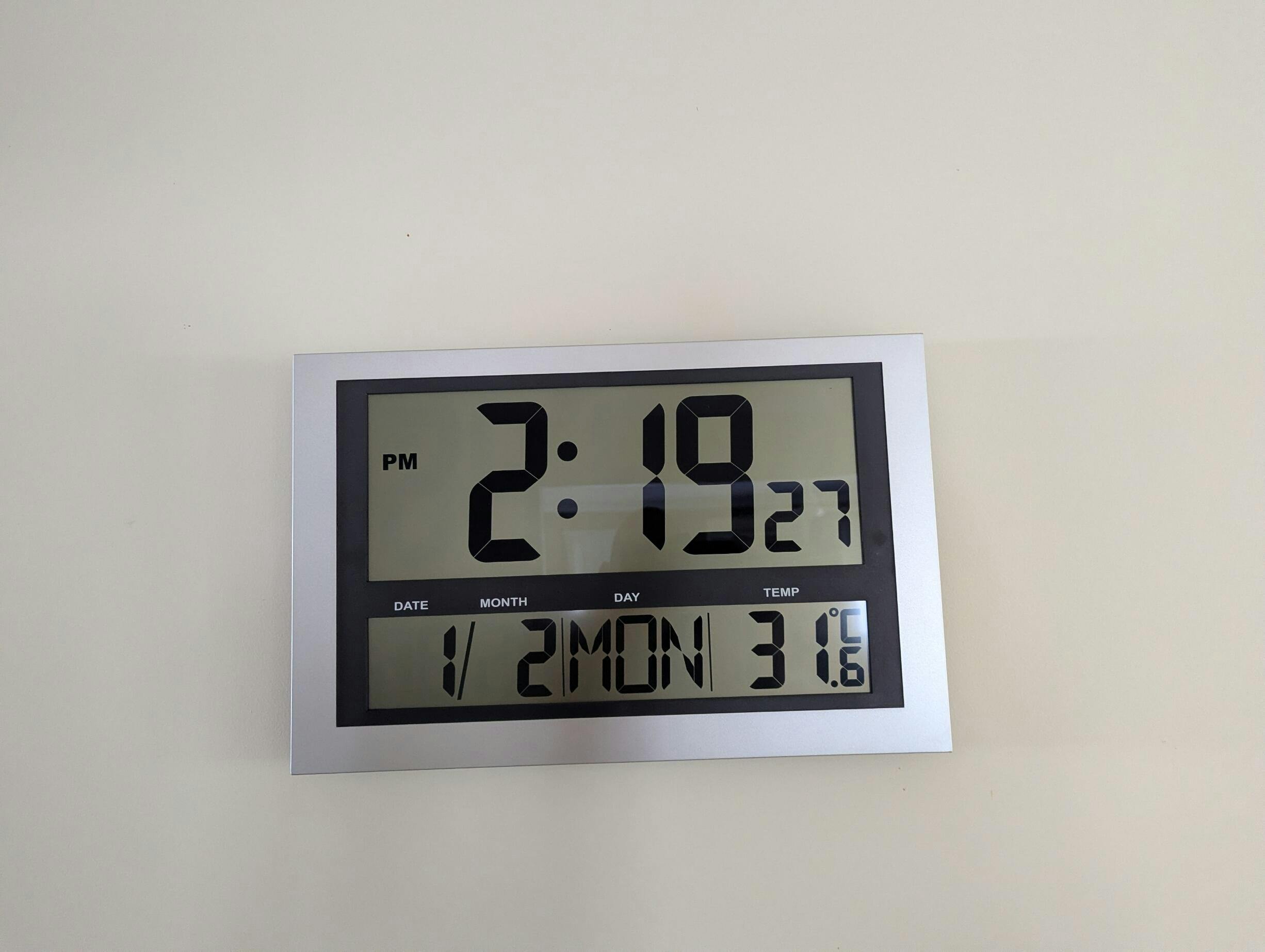 - Mains powered LED with crystal clear display of time, day of the week, time of day, date, month and year
