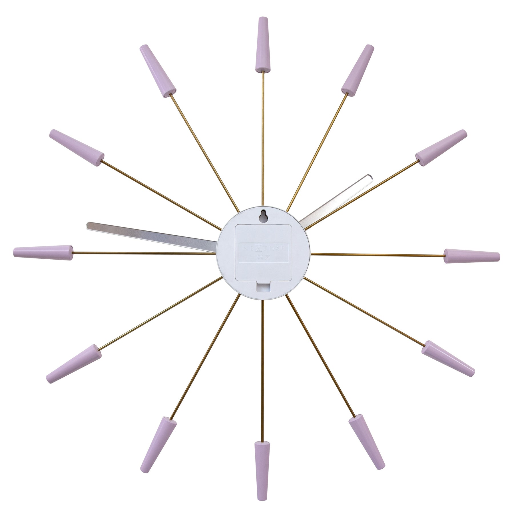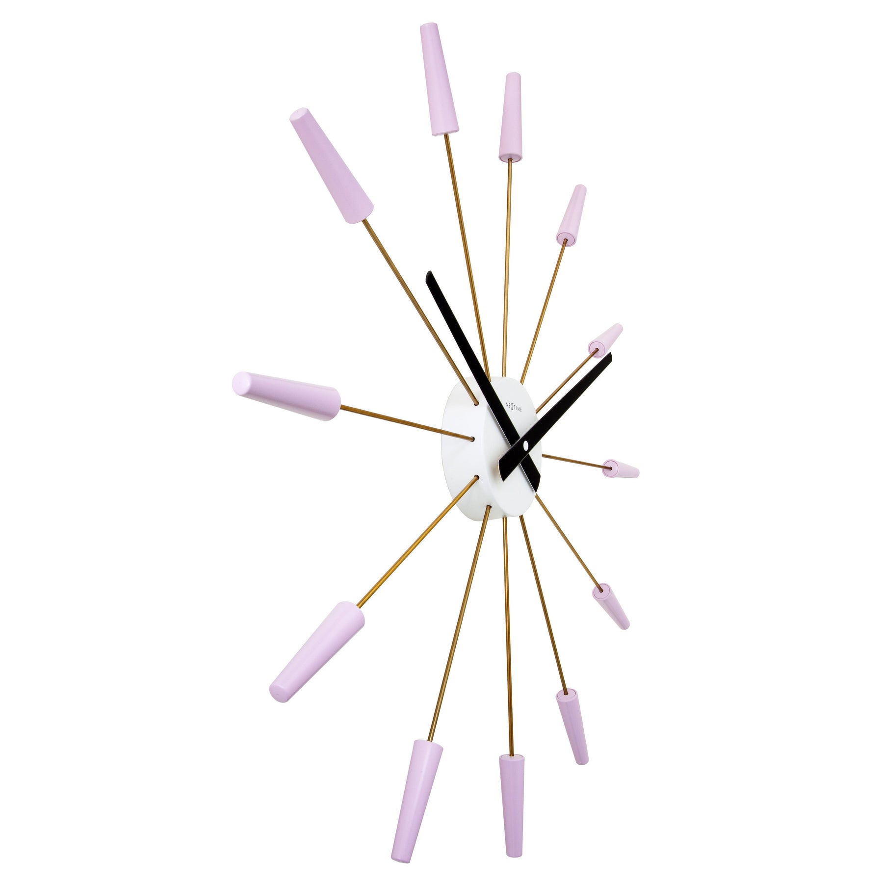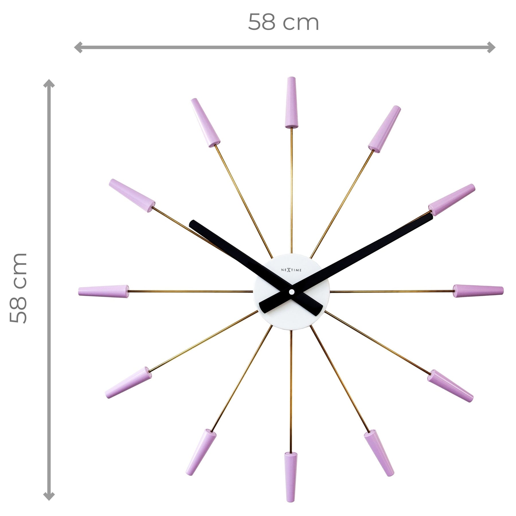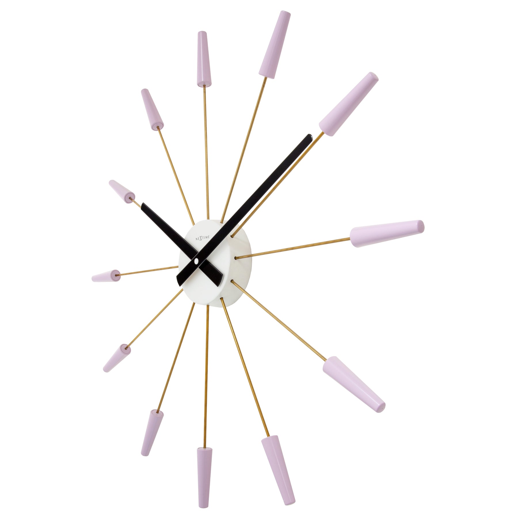 Make a bold design statement with this striking mid-century modern wall clock that transforms timekeeping into sculptural art. The starburst design features bronze metal spokes adorned with lavender plugs that radiate from a clean white centre, creating an eye-catching focal point that commands attention in any room. At 58cm, this substantial piece becomes an instant conversation starter, perfectly suited for generous wall spaces in living areas, offices, or contemporary bedrooms. Bold black aluminium hands ensure effortless time reading against the minimalist dial. The silent movement guarantees peaceful operation, allowing you to enjoy the clock's artistic presence without distraction. Designed by Frits Vink, this NeXtime original combines playful retro charm with modern sophistication.